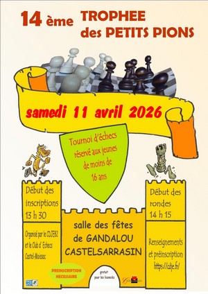 ![]() Rapide du 3e Festival d'échecs de Chalosse 2026 Paiement en ligne avec Hello Asso |